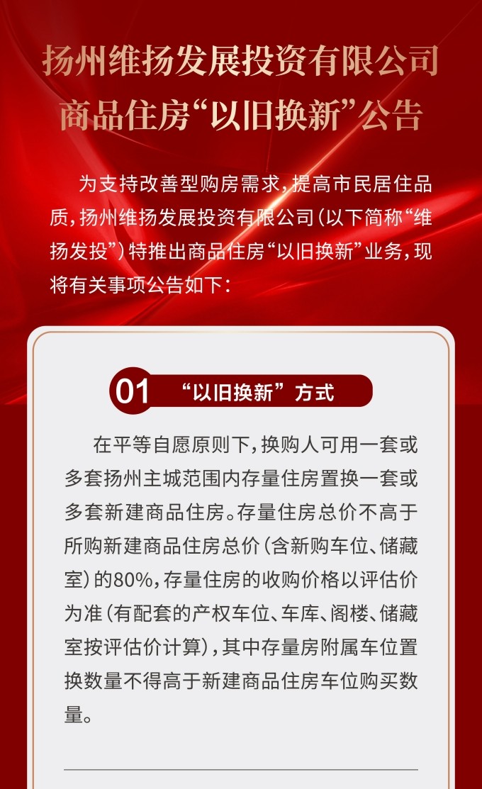 住房“以舊換新”“以房換房”是各地房地產(chǎn)新政中以“小細(xì)節(jié)”撬動“大市場”的重要舉措。維揚發(fā)投積極響應(yīng)政府新推行的“以舊換新”政策,踐行“惠民”理念,整合各項資源,搭建換房中心平臺,為買房人提供一站式以舊換新置換服務(wù),推動激活邗江區(qū)商品房市場活力。