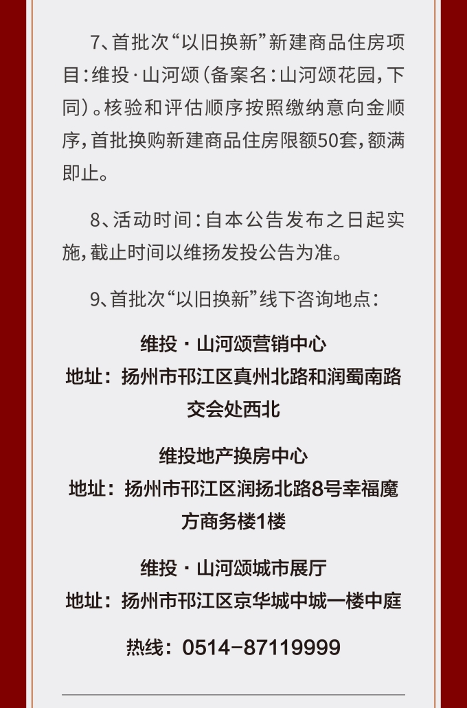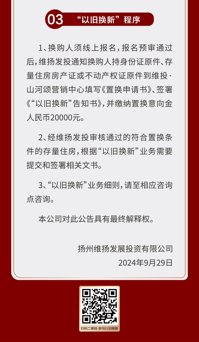 此次維揚發(fā)投“以舊換新”工作以其自主開發(fā)的維投·山河頌項目為試點,由國企背書、置換范圍廣、全流程專業(yè)服務(wù)。首批換購新建商品住房限額50套,換購人可通過登錄“維揚發(fā)投商品住房‘以舊換新’線上報名系統(tǒng)”報名,具體要求詳見公告。